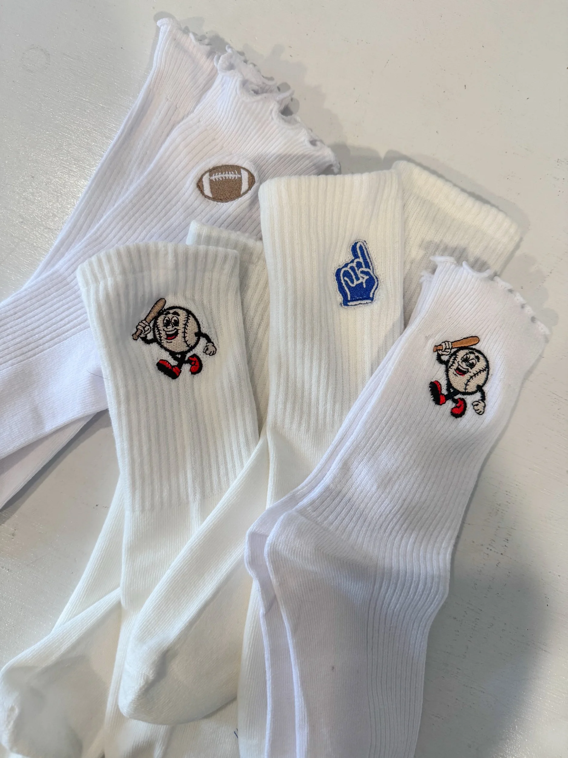 Choose from basic ribbed socks or ruffled socks. Featured in White. Choose from the drop down menu for style. Please include thread color, if applicable in personalization box. Fits most size 5-10.