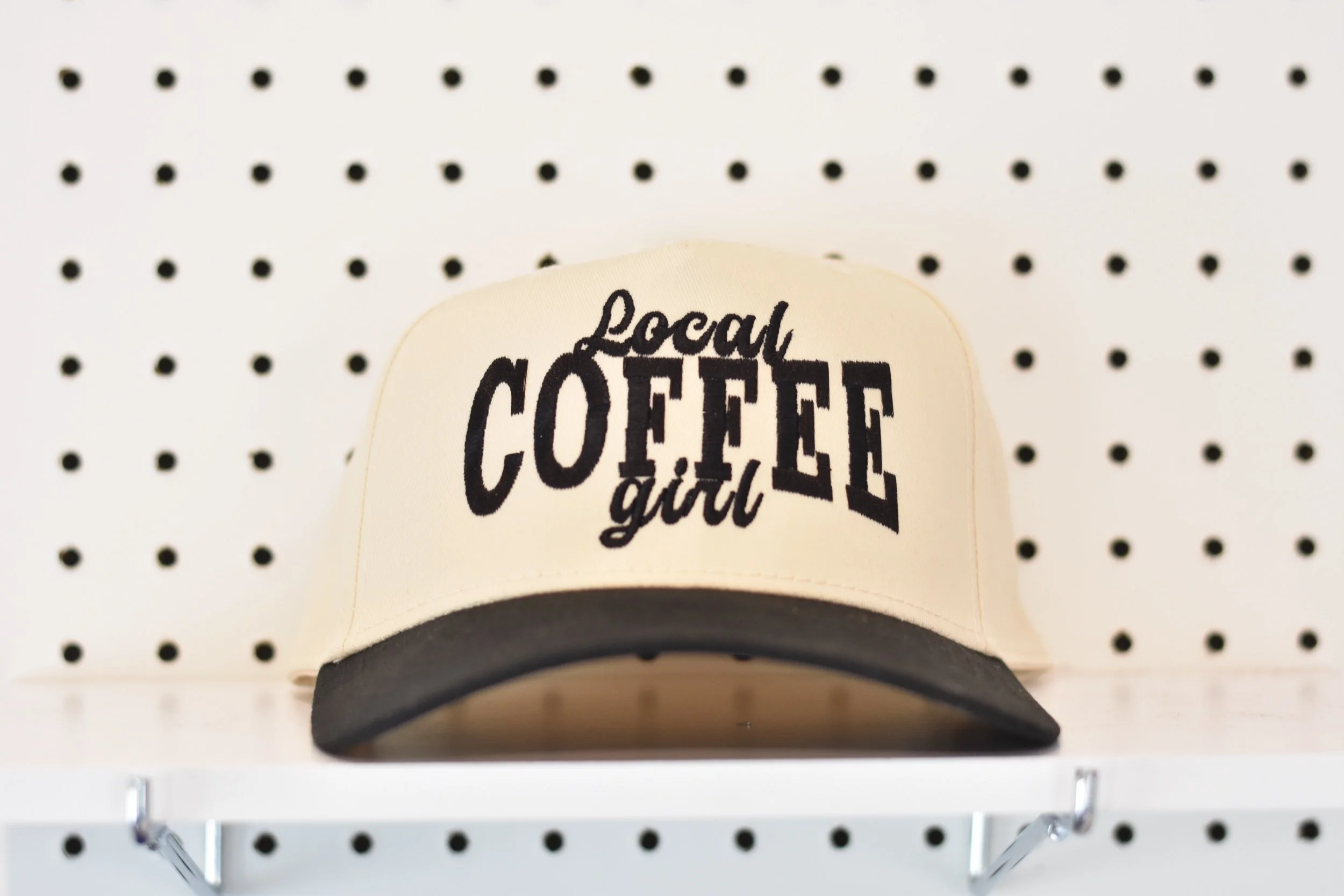 Trucker style hat with, “Local Coffee Girl” across front, retro cartoon coffee cup detail on side with optional back detail of, “How Many Shots?”